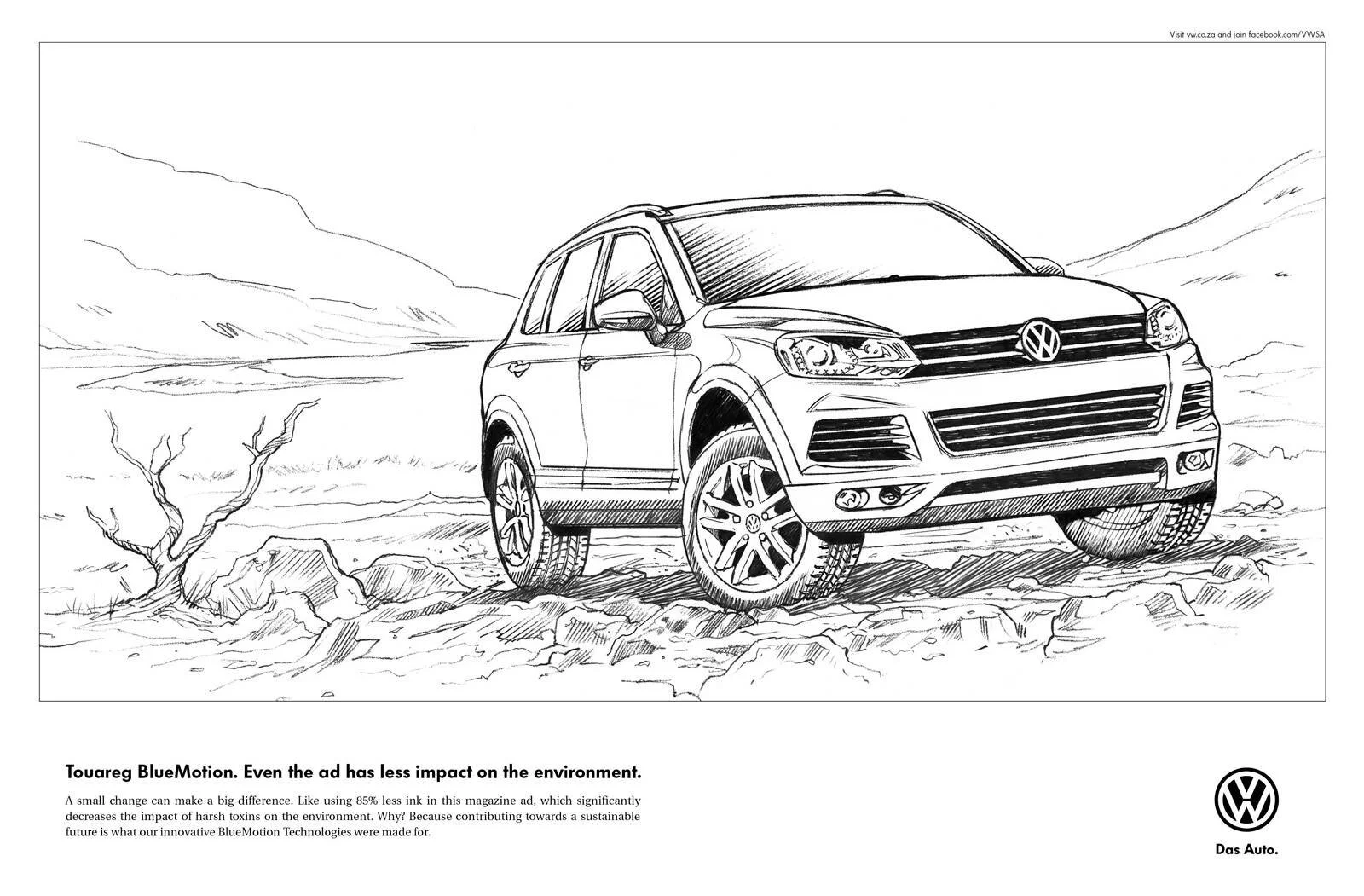 This is a print ad for a magazine in South Africa with a visual of Touareg BlueMotion in what’s presumably an African landscape. Instead of relying on costly photography and clever play on lights to emphasize the vehicle’s style and versatility, the artist decides to take a minimalistic approach with a black and white drawing.