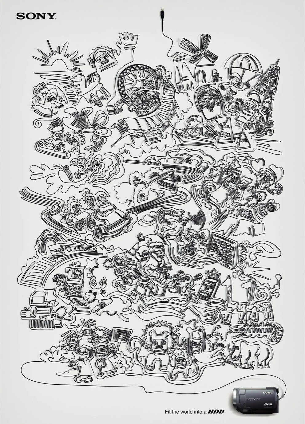 This is a busy print ad constructed with single line drawing, camouflaged by a USB cable connected to a camcorder. It’s a jumble of snapshots depicting various life adventures such as a man with a parachute, a race track, a variety of animals, the pyramids, and more.